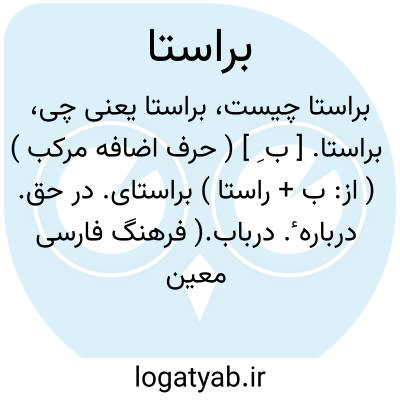 براستا. [ ب ِ ] ( حرف اضافه مرکب ) ( از: ب + راستا ) براستای. در حق. درباره ٔ. درباب.( فرهنگ فارسی معین ): اینک عنان با عنان تو نهادم مکافات این مکرمت را که براستای من کردی. ( تاریخ بیهقی ). و هارون براستای وی ( فضل برمک ) آن نیکویی فرمود کز حد بگذشت. ( تاریخ بیهقی چ فیاض ص 415 ).