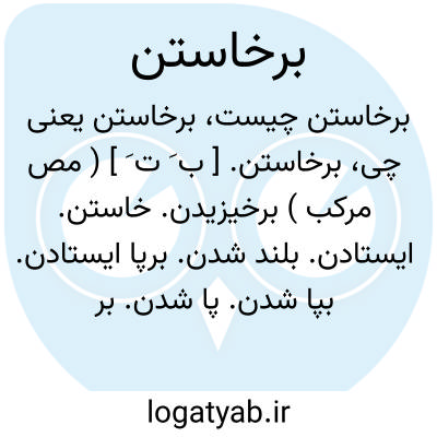 برخاستن. [ ب َ ت َ ] ( مص مرکب ) برخیزیدن. خاستن. ایستادن. بلند شدن. برپا ایستادن. بپا شدن. پا شدن. برپا شدن. متصاعد شدن. قیام. قیام کردن. قوم. قومة. قامة. مقابل نشستن. مقابل قعود. نهض. نهوض. انتهاض. ( منتهی الارب ). استنهاض. نهضت: رأس العین شهری است خرم و اندر وی چشمه هاست بسیار و از آن چشمه ها پنج رود برخیزد و به یکجای گرد شود، آن را خابورخوانند. ( حدودالعالم ). رسول برخاست و نامه در خریطه دیبای سیاه پیش تخت برد و بدست امیر داد و بازگشت.( تاریخ بیهقی ). برخاست تا برود احمد گفت بگیرید این سگ را. ( تاریخ بیهقی ). در آن روزگار ایشان را در نشستن و برخاستن برآن جمله دیدم که ریحان خادم گماشته ٔامیر محمود بر سر ایشان بود. ( تاریخ بیهقی ). کسی راکه پیهای پای سست شود و بر نتواند خاست... پای را در میان آب جو بنهند تا بصلاح باز آید. ( نوروزنامه ).