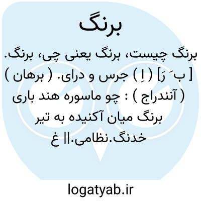 برنگ. [ ب ِ رَ] ( اِخ ) دهی است از بخش پشت آب شهرستان زابل. سکنه آن 107 تن است. آب آن از رودخانه هیرمند و محصول آن غلات و لبنیات است. ( از فرهنگجغرافیایی ایران ج 8 ).