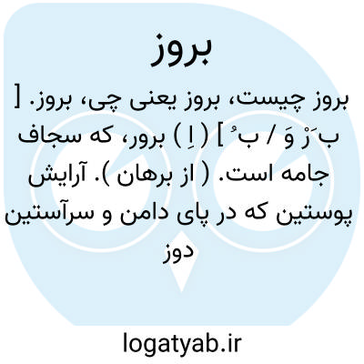 بروز. [ ب َرْ وَ / ب ُ ] ( اِ ) برور، که سجاف جامه است. ( از برهان ). آرایش پوستین که در پای دامن و سرآستین دوزند. ( هفت قلزم ) ( شرفنامه منیری ). رجوع به بَروَر شود. || پیوند و جامه که پوشیدنی و گستردنی باشد. ( هفت قلزم ). پیوند جامه گستردنی یا پوشیدنی، لونی پس از لونی دیگر. ( شرفنامه منیری ).