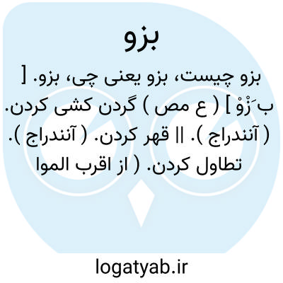بزو. [ ب َزْوْ ] ( ع مص ) گردن کشی کردن. ( آنندراج ). || قهر کردن. ( آنندراج ). تطاول کردن. ( از اقرب الموارد ). تطاول کردن و غالب شدن بر کسی. ( ناظم الاطباء ). || سخت گرفتن. ( آنندراج ). || مقهور کردن و دارگیر نمودن. ( ناظم الاطباء ). مقهور کردن. ( المصادر زوزنی ). || کار کردن. ( آنندراج ). || بزا ( کجی پشت ) گردیدن. ( ناظم الاطباء ). مبتلا به بیماری بزا شدن. ( از اقرب الموارد ).