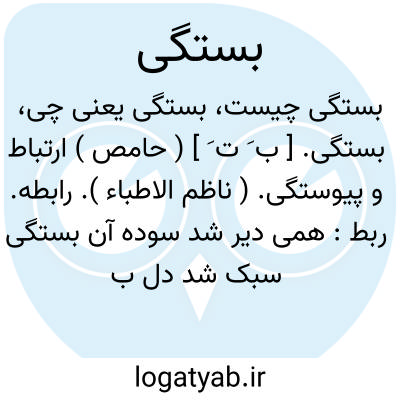 در بستگی را گشاینده باش.نظامی.چون بستگی رسد بنهایت گشادگیست.وحید قزوینی. || تیرگی. گرفتگی رنگ. ناشفاف بودن: آن سپیدی که خالص نیست از سرخی یا زردی یا تیرگی یا بستگی. ( التفهیم ص 368 ). سبب بودن گوناگون صورتهای نور، اندر ماه سه چیز است... یکی بستگی وگرفتگی و دیگر بی نوری. ( التفهیم ). || قبض ( در معده ). یبوست. سدّه: و این بود تا سال دیگر که جو رسد از رنج بستگی... ( نوروزنامه منسوب به خیام ). تغلب گفت: اصل او [ یعنی تفسیر ] من حسرت الفرس اذا رکضتها محصورة لینطلق حصرها؛ اصل او آن باشد که اسب شکم گرفته بتازی تا بستگیش گشاده شود. ( ابوالفتوح رازی ). || قبض. گرفتگی ( در اصطلاح تصوف ). || عقده. ( ترجمان القرآن عادل بن علی ). تعقید. اغلاق. عقد و بند و علاقه. ( ناظم الاطباء ). || سکر طبع. ( فرهنگ فارسی معین ). || لکنت و گرفتگی زبان. ( ناظم الاطباء ). حصر: عقله؛ بستگی زبان. عجمه؛ بستگی در سخن. ( منتهی الارب ).