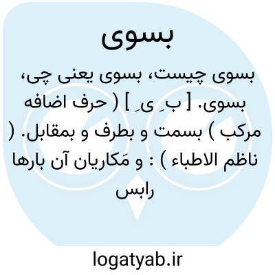 بسوی. [ ب ِ ی ِ ] ( حرف اضافه مرکب ) بسمت و بطرف و بمقابل. ( ناظم الاطباء ): و مَکاریان آن بارها رابسوی خانه خود بردن اولی تر دیدند. ( کلیله و دمنه ).طلب دنیا بر وجه احسن کنید که هرکه از شما ساخته آن باشد که او را بسوی آن آفریده اند. ( ترجمه مکارم الاخلاق خواجه ). چون بنماز شوند نه سلام بسوی خدا کنند و نه بسوی عبادت خدا. ( ایضاً ). روباهی سگ می طلبید درو نرسید گفتند سخت بدویدی تا از سگ دور شدی گفت سگ بسوی مزدی میدوید که از غیر بستاند و من بجهت خود میدوم. ( ایضاً ). || برای. بجهت: قول مشتمل بر زیادت از یک قول بسوی آن گفته اند تا معلوم باشد که قیاس بیرون این قولها که مقدماتست بر ترتیبی مخصوص چیزی دیگر نیست. ( اساس الاقتباس چ 1 ص 187 ). پس گفتند هیچ طعام داری ؟ گفت بجز این بزک هیچ ندارم. اورا بکشید تا بسوی شما چیزی سازم که بخورید... مرد خشم گرفت و گفت گوسفند مرا بسوی قومی که ایشان را نمی شناسی کشتی. ( ترجمه مکارم الاخلاق خواجه ). بسوی دنیا عمل کن بقدر مقام درو و بسوی آخرت همچنین. ( ایضاً ).
