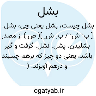 بشل. [ ب َ ش َ / ب ِ ش ِ ]( ص ) از مصدر بشلیدن. پشل. نشل. گرفت و گیر باشد، یعنی دو چیز که برهم چسبند و درهم آویزند. ( برهان ). دو چیز بیکدیگر ملصق شده و در هم آویخته. ( ناظم الاطباء ). دو چیز که برهم گیرند. ( سروری ). گرفت و گیر است که دو تن برهم چسبند و درهم آویزند. ( از انجمن آرا ) ( آنندراج ). || ( فعل امر ) امر بدر آویختن و چسبیدن. ( از برهان ). درآویز. ( از اوبهی ) ( مؤید الفضلاء ) ( صحاح الفرس ) ( شرفنامه منیری ). درآویز و بچسب. ( سروری ) ( شعوری ج 1 ورق 176 ). بیاویز. گویند: دربشل؛ یعنی درآویز. ( لغت فرس اسدی ). امر بدرآویختن نیز آمده و بشلد یعنی بچسبد و درآویزد. ( انجمن آرا ) ( آنندراج ). رجوع به بشلیدن شود.