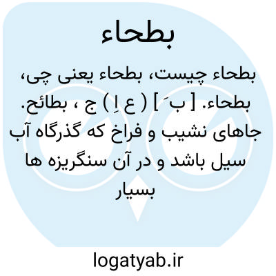 بطحاء. [ ب َ ] ( ع اِ ) ج، بطائح. جاهای نشیب و فراخ که گذرگاه آب سیل باشد و در آن سنگریزه ها بسیار باشند. ( غیاث ). آب رفتنگاه فراخ که درو سنگریزه ها باشند. ( مؤید الفضلاء ). رود فراخ که در آن سنگ ریزه بود. ج، بطائح. ( مهذب الاسماء ). بطحاوات. ( اقرب الموارد ). زمین فراخ که از گذرگاه آب سیل باشد و در آن سنگریزها بسیارباشد. ( آنندراج ) ( فرهنگ نظام ). جوی در سنگلاخ. ( ناظم الاطباء ) ( منتهی الارب ). || ته دره را بطحاءمی نامند که خانه کعبه در آنجاست. ( تاریخ اسلام چ 2 ص 54 ). و رجوع به قاموس الاعلام ترکی ج 2 و لغات تاریخیه و جغرافیه ج 2 و بَطِح و بطیحة شود. || سرزمین فراخ هموار. ( مؤید الفضلاء ). || میدان مشق. || میدان اسب دوانی. ( ناظم الاطباء ).