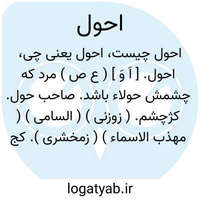 احول. [ اَ وَ ] ( ع ص ) مرد که چشمش حولاء باشد. صاحب حول. کژچشم. ( زوزنی ) ( السامی ) ( مهذب الاسماء ) ( زمخشری ). کج چشم. کژ. کاژ. کاج. کوچ. کلک. کلیک. کلیک چشم. ( دستور ). چپ. دوبین. دوبیننده. اخلف. ( منتهی الارب ). کسی که یک چیز را دو بیند. ( غیاث ). آنکه یکی را دو بیند. ( مؤید ). احدر. کلاژ. کلاژه.کلاجو. کلاذه. لوش. لوچ. چشم گشته. ( صحاح الفرس ). گشته کاینه. شاه کال. رنگ. صاحب آنندراج بنقل از منتخب گوید: آنچه مشهور است که احول فطری یکی را دو می بیند غلطاست مگر آنکه بنادر یافته شود اما احول که بتکلف چشم را کج کند اکثر اوقات یکی را دو بیند: