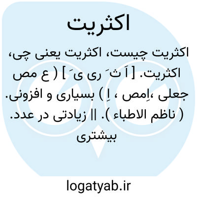 ( مصدر ) ۱ - اکثر بودن مقابل اقلیت. ۳- بیشتر افراد یک کشور یک منطقه یا شهر که از جهت زبان مذهب یا نژاد با هم وجه اشتراکی دارند مقابل اقلیت. یا اکثریت تام اکثریت مطلق. تعداد آرایی است که لااقل مساوی نصف بعلاو. یک باشد. یا اکثریت نسبی. تعداد آرایی است که داوطلبی بدست میاورد بشرطی که زیادتر از آرائ داوطلبان دیگر باشد.