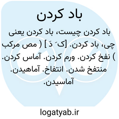 ( مصدر ) ۱ - باد زدن.۲ - پر باد شدن داخل چیزی: شکمش باد کرده لباسش باد کرده. ۳ - افاده کردن فیس کردن خود راگرفتن با کبر و نخوت رفتار کردن. ۴ - بیحاصل ماندن و بفروش نرفتن کالایی و در دست صاحبش باقی ماندن: اجناس فلان فروشنده بعلت پیدا نشدن خریدار باد کرد ( بفروش نرفت ). ۵ - کسی را بکاری صعب بر انگیختن تیر کردن. ۶ - بباد دادن محو کردن. ۷ - دمیدن در سازهای بادی و بصدا در آوردن آنها. ۸- گذاشتن باد کش روی قسمتی از سطح بدن که مراد احتقان موقتی آن قسمت از بدن بمنظور رفع درد یا رفع عفونت باشد خون را بوسیل. شاخ حجامت و با استکان بادکش در قسمت معینی از زیر پوست جمع کردن شیشه یا شاخ حجامت گذاشتن. یا باد کردن لاستیک. بوسیل. تلمب. دستی یا پایی یا برقی با فشار و صرف نیرو مقداری هوا را در داخل لاستیک چرخ یا اتومبیل متراکم کنند تا بدان وسیله از نیروی اصطکاک بکاهند و ضمنا سطح اتکائ را هر چه ممکن است کوچگتر و کمتر نمایند.