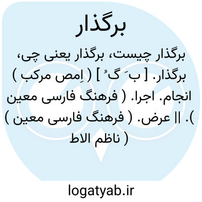 برگذار. [ ب َ گ ُ ] ( اِمص مرکب ) انجام. اجرا. ( فرهنگ فارسی معین ). || عرض. ( فرهنگ فارسی معین ) ( ناظم الاطباء ). || ( اِ مرکب ) انعام. عطیه. بخشش. ( از آنندراج ) ( ناظم الاطباء ):