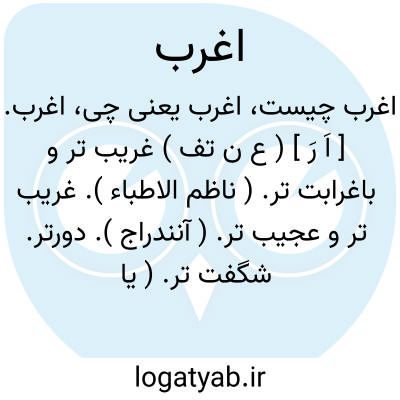 اغرب. [ اَ رَ ] ( ع ن تف ) غریب تر و باغرابت تر. ( ناظم الاطباء ). غریب تر و عجیب تر. ( آنندراج ). دورتر. شگفت تر. ( یادداشت مؤلف ).