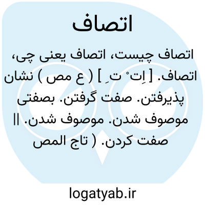 اتصاف. [ اِت ْ ت ِ ] ( ع مص ) نشان پذیرفتن. صفت گرفتن. بصفتی موصوف شدن. موصوف شدن. || صفت کردن. ( تاج المصادر ). || با هم ستودن چیزی را. || ستوده شدن. || نشان پذیری.