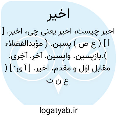 اخیر. [ اَ ] ( ع ص ) پسین. ( مؤیدالفضلاء ).بازپسین. واپسین. آخر. آخِری. مقابل اوّل و مقدم.