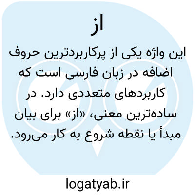 این واژه یکی از پرکاربردترین حروف اضافه در زبان فارسی است که کاربردهای متعددی دارد. در سادهترین معنی، «از» برای بیان مبدأ یا نقطه شروع به کار میرود، مانند «از خانه آمدم». این حرف اضافه همچنین برای بیان علت یا دلیل استفاده میشود، مانند «از ترس فرار کرد». این واژه در بسیاری جملات برای بیان نسبت یا انتساب به کار میرود، مانند «کتاب از آن علی است». گاهی این حرف اضافه برای بیان تمایز یا مقایسه بین دو چیز کاربرد دارد، مانند «بهتر از آن است». در برخی موارد، برای بیان وسیله یا ابزار نیز استفاده میشود، مانند «نامه را از طریق پست فرستاد». این حرف اضافه میتواند زمان یا دورهای مشخص را نیز نشان دهد، مثل «از دیروز باران میبارد». در متون ادبی، این واژه برای شروع حکایت یا نقل قول به کار میرود، مانند «از قول استاد گفته شد». این کلمه به طور کلی وسیلهای برای وصل کردن اجزاء جمله و نشان دادن رابطه بین آنها است.