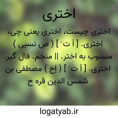 اختری. [ اَ ت َ ] ( اِخ ) مصطفی بن شمس الدین قره حصاری. یکی از علمای دوره سلطان سلیمان قانونی است. مولد او قره حصار صاحب است سپس به کوتاهیه هجرت کرده و در آنجا بتدریس پاره ای علوم مشغول بود. وفات او بسال 968 هَ. ق. است. در اکثر علوم خاصه در ادبیات عربی و علم لغت صاحب ید طولی بود. از تألیفات او یکی لغت مترجم عربی بترکی است بنام اختری و آن را دوبار تألیف کرده یکی بنام اختری کبیر و دیگری صغیر. و نیز او را مجموعه ای است در مسائل فقهیه بنام جامعالمسائل معروف به ام الفتاوی. و رجوع به قاموس الاعلام شود.