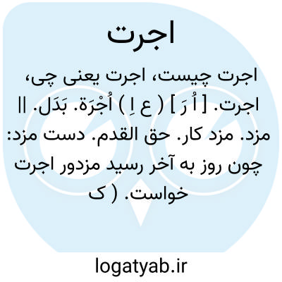 اجرت. [ اُ رَ ] ( ع اِ ) اُجْرَة. بَدَل. || مزد. مزد کار. حق القدم. دست مزد: چون روز به آخر رسید مزدور اجرت خواست. ( کلیله و دمنه ). || کرایه: یارش از کشتی به درآمد که پشتی کند همچنین درشتی دید... چاره جز آن ندانستند که با او بمصالحت گرایند و به اجرت کشتی مسامحت کنند. ( گلستان ). || قیمتی که در مقابل استفاده از منافع بر عهده شخص مستقر میشود. مستأجر با قبض موضوع اجاره و گذشتن مدتی که در ظرف آن استیفای منافع ممکن بود، مدیون اجرت میشود اگرچه انتفاعی هم نبرده باشد.