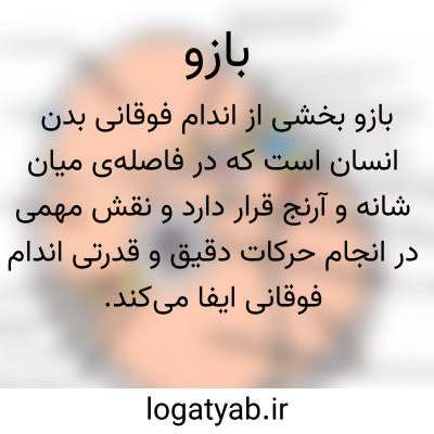( اسم ) ۱ - قسمتی از دست که بین آرنج و شانه قرار دارد عضد. ( جمع: بازوان ). ۲ - هر یک از دو چوب کنار درگاه.۳ - اطراف تخت خوابگاه. ۴ - واحد طول برابر با طول بازو گز. ۵ - رفیق مصاحب. ۶ - آنکه در سرود با کسی همراهی کند. ۷ - قوت قدرت نیرو. یا بازوی چیزی داشتن. ۱ - لایق بودن برای انجام دادن آن کار. ۲ - قوت داشتن نیرو داشتن. یا بازو ستون کردن. محکم و سخت کردن بازوی چپ را در هنگام کشیدن کمان.