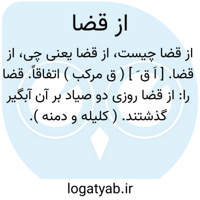 از قضا. [ اَ ق َ ] ( ق مرکب ) اتفاقاً. قضا را: از قضا روزی دو صیاد بر آن آبگیر گذشتند. ( کلیله و دمنه ).