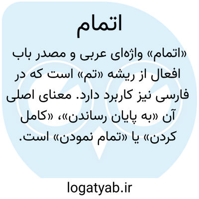 «اتمام» واژهای عربی و مصدر باب اِفعال از ریشه «تَمَّ» است که در فارسی نیز کاربرد دارد. معنای اصلی آن «به پایان رساندن»، «کامل کردن» یا «تمام نمودن» است. این کلمه معمولاً در متون رسمی، دینی و ادبی برای اشاره به کامل شدن یا پایان یافتن یک کار یا عمل به کار میرود.