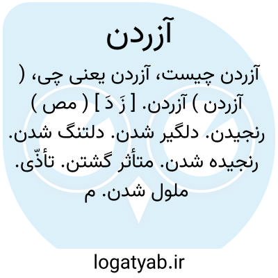 ( آزردن ) ۱ - ( مصدر ). رنجیدن دلگیر شدن متاثر گردیدن. ۲ - ( مصدر ) رنجانیدن رنجه کردن گزند رسانیدن. ۳ - بغضب آوردن خشمگین کردن. ۴ - مجروح کردن خستن.