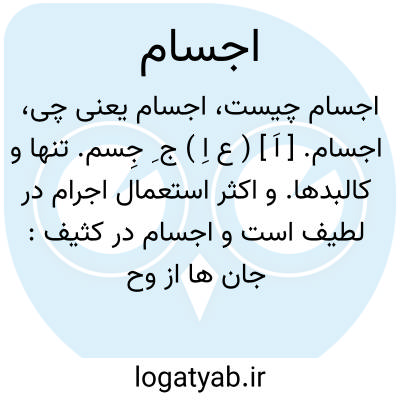 ( اسم ) جمع: جسم تن ها کالبدها. یا اجسام آلی ( آلیه ). ۱ - هر جسم که اسم کل بر جزو آن صدق نکند اجسام دارای اجزائ که مجموع آن مای. حیات است. ۲ - ترکیباتی هستند که بدن گیاهان و جانوران را تشکیل می دهند و چون هنگام سوختن آنها اگر اکسیژن بانداز. کفایت نباشد مقداری کربن از خود باقی می گذارند از اینجهت آنها را ترکیبات کربن مینامند آلی. یا اجسام بسیط ( بسیطه ) ۱ - عناصر اربعه را در حال خلوص و بساطت اجسام بسیط گویند مث آب در صورتی که با هیچ یک از عناصر دیگر ترکیب نیافته باشد. ۲ - عناصر. یا اجسام شفاف اجسامی هستند که نور از آنها عبور می کند و حاجب ماورائ نیستند و اشیائ پشت سر آنها را بخوبی میتوان دید مانند: شیشه آب زل هوا و غیره. یا اجسام کدر. اجسامی را گویند که نور از آنها عبور نمی کند و بطور کلی حاجب ماورائ هستند مانند: سنگ و چوب. یا اجسام طبیعی. ۱ - مرکب از ماده و صورت جسمی. طبیعیه میباشند در مقابل صورت تعلیمی که اشکال مختلف وارد بر صورت جسمیه یا جسم طبیعی است. ۲ - تصوف عرش و کرسی. یا اجسام علوی. افک و کواکب و بطور کلی موجودات سماوی اجرام علوی. یا اجسام عنصری. موالید ثث و کاینات کهو همواره در معرض کون و فسادند چه آنها از ترکیب عناصر اربعه و تائ ثیرات اجسام و اجرام سماوی و حوادث جوی تکوین مییابند ( بعقید. قدما ). یا اجسام غیر آلی ( آلیه ). اجسام مفرده مقابل اجسام آلی ( آلیه ). یا اجسام مرکب. اجسامی که از دو یا چند عنصر ترکیب شوند مانند آب که از اکسیژن و ئیدرژن و سنگ مرمر که از کربن و اکسیژن و فلزی بنام کلسیم ترکیب شده است. شمار. اجسام مرکب از چند صد هزار هم تجاوز می کند. یا اجسام منیر ( منیره ). اجسامی را گویند که از خود نور و درخشندگی دارند مانند: خورشید فروزان شمع روشن مقابل اجسام مستنیر. اجسامی هستند که از خود نور ندارند و نور میگیرند و برای روئ یت آنها از اجسام منیر باید کسب نور کرد مانند: سنگ خاک ماه و غیره اجسامی را گویند که نور از آنها می گذرد ولی اجسامی را که در پشت آنها واقع شده است نمیتوان روئ یت کرد مانند: کاغذ آلوده بچربی شیش. مات و غیره.