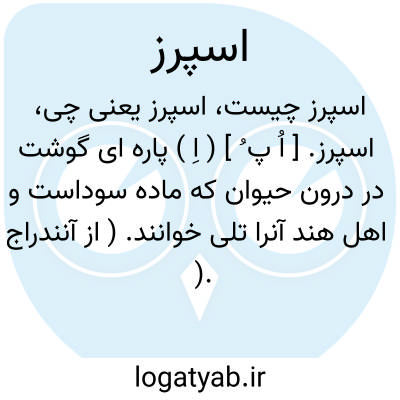 اسپرز. [ اُ پ ُ ] ( اِ ) پاره ای گوشت در درون حیوان که ماده سوداست و اهل هند آنرا تلی خوانند. ( از آنندراج ). سپرز. طحال. رجوع به سپرز شود. || در ترکی زبانک شرم زنان. چوچله. دِلاّق.، اسپ رز. [ اَ رِ ] ( اِ مرکب ) اسپرس. ( جهانگیری ). اسپریس. اسفریس. میدان. فضا. عرصه. ( برهان ). || رزمگاه. رجوع به اسب ریس و اسپ ریس و اسپ رس و اسپرسا شود.
