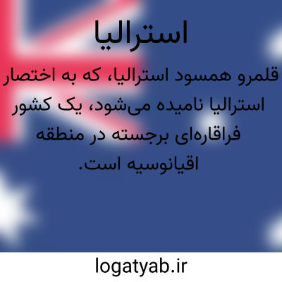 بزرگترین جزیره اقیانوسیه( در اقیانوی کبیر ) که پنجمین قطعه عالم بشمار می رودو آن سرزمینی وسیعی است که مرکزش پست و اطراف آن مرتفع است. در قسمت پست مرکزی دریاچه هایی مانند دریاچه تورنس واقع شده ودر ساحل شرقی آن سلسله جبالی قرار دارد که آن را آلپ استرالیا می گویند وبلندترین قله آن ۳۲۴۱ متر ارتفاع دارد. آب وهوای استرالیا بری است. در قسمت داخل خشک وسوزان ودر قسمت مشرق وجنوب شرقی مرطوب ومعتدل می باشد. محصول استرالیا نیشکر پنبه غلات گوشت است. ومعادن فراوان دارد. رودخانه های مهم آن دارلینگ ومورای است که بیکدیگر متصل می شوند این کشور ۷۷٠۴٠٠٠ کیلومتر مربع مساحت ۱۴۲۶٠٠٠٠ تن جمعیت دارد. استرالیا جزو کشورهای مشترک المنافع بریتانیای کبیر پایتخت آن شهر کانبرا وشهرهای مهم آن عبارتند از ملبورن که ۲۶٠۴٠٠٠ تن و سیدنی ۲۹۳۶٠٠٠ تن جمعیت دارند بریسبان وپرت در استرالیای غربی.