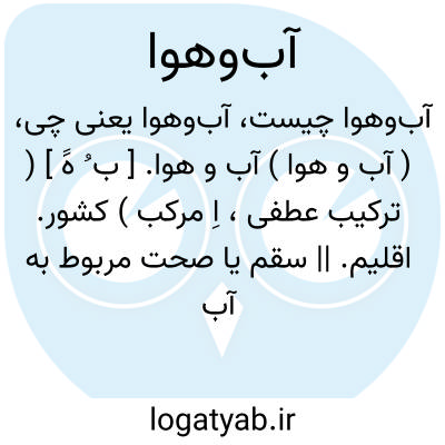 ( آب و هوا ) آب و هوا. [ ب ُ هََ ] ( ترکیب عطفی، اِ مرکب ) کشور. اقلیم. || سقم یا صحت مربوط به آب و هوای ناحیتی.