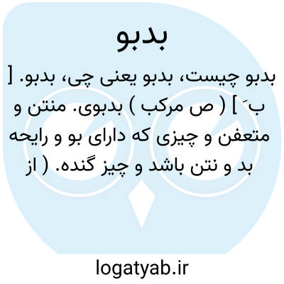 بدبو. [ ب َ ] ( ص مرکب ) بدبوی. منتن و متعفن و چیزی که دارای بو و رایحه بد و نتن باشد و چیز گنده. ( از ناظم الاطباء ). منتن. عفن. نتن. دفر. دفره. گنده.( یادداشت مؤلف ). مقابل خوشبو. ( آنندراج ). دَفَر؛ بدبو شدن طعام. ( منتهی الارب ). و رجوع به بدبوی شود.