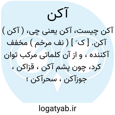 ( آکن ) آکن. [ ک َ ] ( نف مرخم ) مخفف آکننده، و از آن کلماتی مرکب توان کرد، چون پشم آکن، قزاکن، جوزآکن، سحرآکن؛ آنکه پشم، قز، جوز، و سحر آکند.