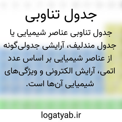 جدول تناوبی عناصر شیمیایی یا جدول مَندَلیُف، آرایشی جدولیگونه از عناصر شیمیایی بر اساس عدد اتمی، آرایش الکترونی و ویژگیهای شیمیایی آنها است. در این جدول، عناصر بهترتیب افزایش عدد اتمی (تعداد پروتونها) چیده شدهاند. شکل استاندارد جدول دارای ابعاد ۱۸ در ۷ است که در آن عناصر اصلی در بخش مرکزی و دو ردیف عناصر در بخش پایینی قرار گرفتهاند. این ساختار را میتوان به چهار بلوک مستطیلی شامل بلوکهای اس (چپ)، پی (راست)، دی (مرکز شامل فلزات واسطه) و اف (پایین شامل فلزات واسطه داخلی) تقسیمبندی کرد. ردیفهای جدول دوره و ستونهای آن گروه نامیده میشوند و برخی گروهها نامهای ویژهای مانند هالوژنها یا گازهای نجیب دارند. هدف اصلی از طراحی این جدول، تسهیل مطالعه و پیشبینی رفتار شیمیایی عناصر است.