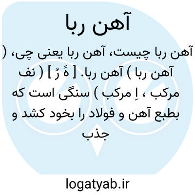 ( آهن ربا ) ( اسم ) ۱ - هر جسمی که آهن فولاد و نیکل را بطرف خود جذب کند مغناطیسی. یا آهن ربای القایی. جسمی که در اثر مجاورت با آهن ربا خاصیت آهن ربایی پیدا کند. یا آهن ربای الکتریکی میله ای آهنی که سیم روپوش داری را چندین بار دور آن پیچیده باشند ( اگر دو سر آنرا در جهت مخالف بپیچند نیروی ربایش آن بیشتر گردد ) و همینکه جریان برق را از سیم روپوش دار عبور دهند میل. آهن خاصیت آهن ربایی پیدا میکند و با قطع جریان الکتریسیته دوباره این خاصیت را از دست میدهد. یا آهن ربای برقی. یا آهن ربای طبیعی. اکسید مغناطیسی آهن است که در طبیعت ایجاد میشود. یا آهن ربای مصنوعی. جسمی است آهن یا فولادی که بوسیل. مالش دادن باهن ربای طبیعی یا آهن ربای مصنوعی دیگر یا بوسیله جریان برق خاصیت آهن ربایی پیدا کند. ۲ - ( خاتمسازی ) آلتی است چهار پهلو که کمر آن خمیده و دو سر آن با هم موازی و هم سطحند و در خاتمسازی از آن استفاده شود.