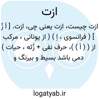 (اَ زُ ) [ فر. ] ( اِ. ) نیتروژن، گازی است بی رنگ و بی بو و بی مزه. در آب بسیار کم حل می شود. علاوه بر هوا در سفیدة تخم مرغ و گوشت و شیر و همچنین در شوره یافت می شود.