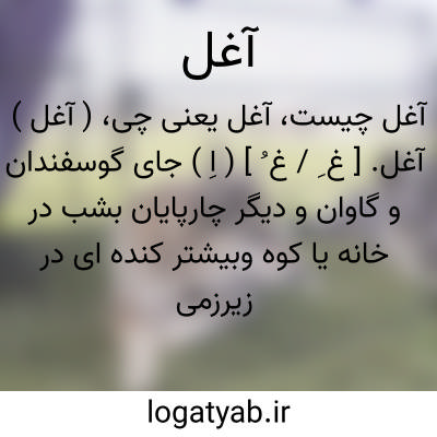 ( آغل ) ( اسم ) جای گوسفندان و گاوان و دیگر چارپایان بشب در خانه یا در کوره و یا در کنده ای در زیر زمین.