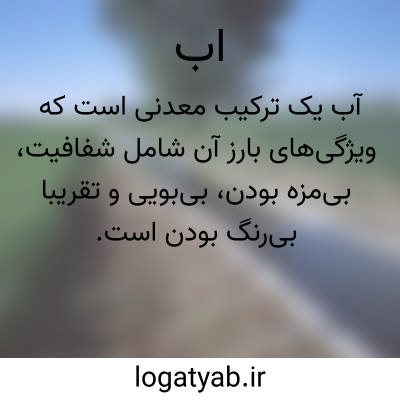 ( آب ) ۱. (شیمی ) ماده ای مایع، بی طعم، بی بو، و مرکب از اکسیژن و هیدروژن با فرمول شیمیایی h۲o که در طبیعت به مقدار زیاد موجود است و سه ربع روی زمین را فراگرفته. در صد درجۀ سانتی گراد جوش می آید و در صفر درجۀ سانتی گراد منجمد می شود.