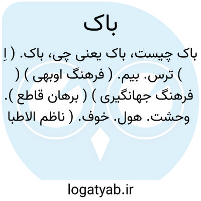 باک. ( اِ ) ترس. بیم. ( فرهنگ اوبهی ) ( فرهنگ جهانگیری ) ( برهان قاطع ). وحشت. هول. خوف. ( ناظم الاطباء ).رعب. روع. جبن. هراس. ( آنندراج ). خشیت: