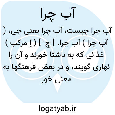 ( آب چرا ) آب چرا. [ چ َ ] ( اِ مرکب ) غذائی که به ناشتا خورند و آن را نهاری گویند، و در بعض فرهنگها به معنی خوراک جن و پری و طیور آورده اند.