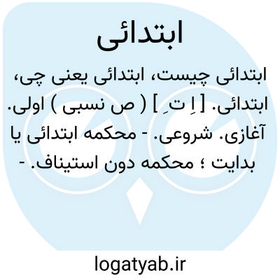 ( صفت ). مقدماتی اولی آغازی. یا مدرس. ابتدائی. مدرسه ای که در آن نخستین دور. تحصیل را فراگیرند پایین تر از دور. متوسطه. یا محکم. ابتدائی. محکم. بدایت محکم. دون استیناف دادگاه شهرستان.