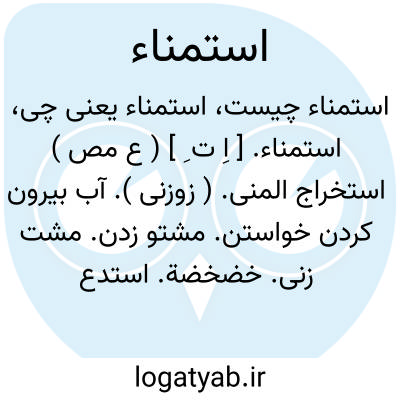 استمناء. [ اِ ت ِ ] ( ع مص ) استخراج المنی. ( زوزنی ). آب بیرون کردن خواستن. مشتو زدن. مشت زنی. خضخضة. استدعاء خروج المنی. ( تاج المصادر بیهقی ). بیرون کردن منی. || در ایام منیة درآمده شمردن ناقة را. ( منتهی الارب ). || به منی ̍ رسیدن.
