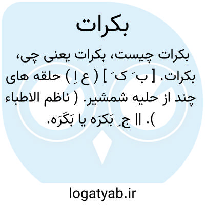 بکرات. [ ب َ ک َ ] ( ع اِ ) حلقه های چند از حلیه شمشیر. ( ناظم الاطباء ). || ج ِ بَکرَه یا بَکَرَه. ( ناظم الاطباء ) ( منتهی الارب ). رجوع به بکرة شود. || ( اِخ ) چند کوه است بلند نزدیک بکرة. و چند پشته های سیاه است در رحرحان یا در راه مکه. ( منتهی الارب ).