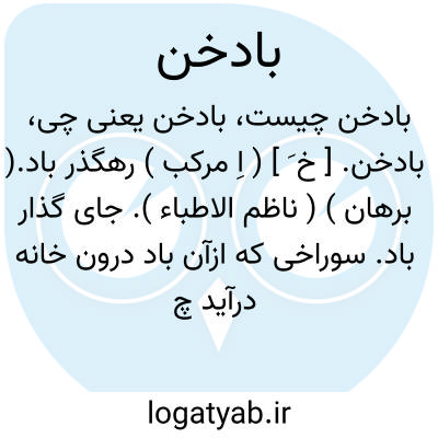 دانی آخر کاین ترفع بود باد بادخن.سنائی ( از آنندراج ) ( از انجمن آرا: بادپروا ).رجوع ببادخوان، بادخون، بادپروا و بادگیر شود. || بادگیر و خانه بادگیر. خن بمعنی خانه آمده است. ( برهان ). خانه ای را گویند که بادگیر داشته باشد چه خن مخفف خانه است. ( آنندراج ). بادگیر. خانه بادگیردار. || تندباد و طوفان و گردباد. ( ناظم الاطباء ). || چوبیست مجوف که اطفال در دهن گیرندو باد دردَمند و چرخ و آسیای کاغذ را به گردش آرد. ( از فرهنگ خطی متعلق بکتابخانه مرحوم دهخدا ).