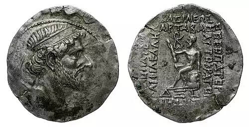 یک تترادراخما منحصر به فرد، به تاریخ DXS ( ۴۸–۴۷ پ. م ) و در پشت آن یک نوشته یونانی قرار گرفته و این متن را به نمایش می گذارد.