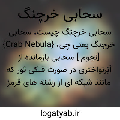 {Crab Nebula} [نجوم ] سحابی بازمانده از اَبَرنواختری در صورت فلکی ثور که مانند شبکه ای از رشته های قرمزرنگ به نظر می رسد که ناحیه ای بیضی شکل را فراگرفته است