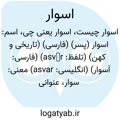 اسوار. [ اَس ْ ] ( ص، اِ ) ( در پهلوی: اسوار، اوستایی: اسبارای، بمعنی برنده اسب ) سوار. فارس. مقابل پیاده. ( انجمن آرا ). || نامی بوده که ایرانیان به مرد دلیر و یل مشهور میداده اند. ( مفاتیح العلوم خوارزمی ).