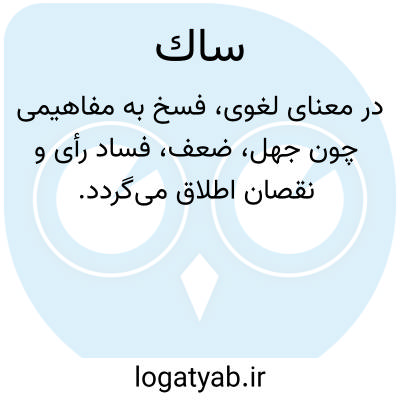 ساک. ( اِ ) بمعنی فسخ باشد و فسخ در لغت بمعنی جهل و ضعف و فساد رای و نقصان است و در طریق اهل تناسخ آن است که روح به دو مرتبه فرو رود یعنی از صورت انسانی بصورت نباتی چمن آرا گردد. ( برهان ). || بمعنی رسخ است، و رسخ در لغت ثبوت باشد و به اصطلاح اهل تناسخ آن است که روح انسانی به سه مرتبه تنزل نماید یعنی از صورت انسانی بصورت حیوانی و از صورت حیوانی بصورت نباتی و ازصورت نباتی بصورت جمادی نزول کند. ( انجمن آرا از فرهنگ دساتیر ) ( آنندراج ).