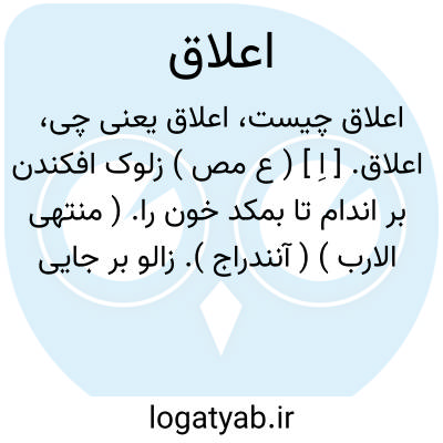 اعلاق. [ اِ ] ( ع مص ) زلوک افکندن بر اندام تا بمکد خون را. ( منتهی الارب ) ( آنندراج ). زالو بر جایی افکندن تا خون آنرا بمکد. و منه الحدیث: اللدود احب الی من الاعلاق. ( از اقرب الموارد ). زکوک انداختن بر اندام تا بمکد خون را. ( ناظم الاطباء ). || مال نفیس یافتن. ( منتهی الارب ) ( آنندراج ) ( ناظم الاطباء ). مال پربها یافتن. ( از اقرب الموارد ). || بلا و سختی آوردن، یقال: اعلقت و افلقت؛ ای جئت بعلق فلق. ( منتهی الارب ). بلا و سختی آوردن. ( آنندراج ) ( ناظم الاطباء ). بلا و گرفتاری پدید آوردن: اعلقت و افلقت؛ ای جئت بعلق فلق. ( از اقرب الموارد ). || فراگرفتن دو شتر را به رسن دلو. ( منتهی الارب ) ( آنندراج ) ( ناظم الاطباء ). با کنار رسن دلو دو شتر را بهم بستن. ( از اقرب الموارد ). یقال: اعلق بالغرب بعیرین؛ ای قرنهما بطرف رشائه. ( اقرب الموارد ) ( منتهی الارب ). || علاقه ساختن برای تازیانه و کمان و جز آن. ( منتهی الارب ) ( آنندراج ) ( ناظم الاطباء ). علاقه قرار دادن برای کمان و جز آن که به آن تعلق گیرد. ( ازاقرب الموارد ). چیزی را علاقه کردن. ( تاج المصادر بیهقی ) ( المصادر زوزنی ). || در دام افکندن شکار را، یقال للصائد: اعلقت فادرک؛ ای علق الصید بحبالتک. ( منتهی الارب ). در دام افکندن شکار را. ( آنندراج ) ( ناظم الاطباء ). بدام افکندن صیاد صید را. ( از اقرب الموارد ). || چنگال درزدن بچیزی. و منه الحدیث: اللدود احب الی من الاعلاق. ( منتهی الارب ). چنگال درزدن بچیزی. ( آنندراج ) ( ناظم الاطباء ). ناخن یا چیزی که بدو ماند بجایی فروبردن. ( مصادر زوزنی ). چنگ درزدن بچیزی. ( یادداشت بخط مؤلف ). || برداشتن بچه را از حاجتگاه. ( منتهی الارب ) ( از آنندراج ) ( ناظم الاطباء ). برداشتن زن بچه را از حاجتگاه. ( از اقرب الموارد ). کودک برگرفتن. ( تاج المصادر بیهقی ).