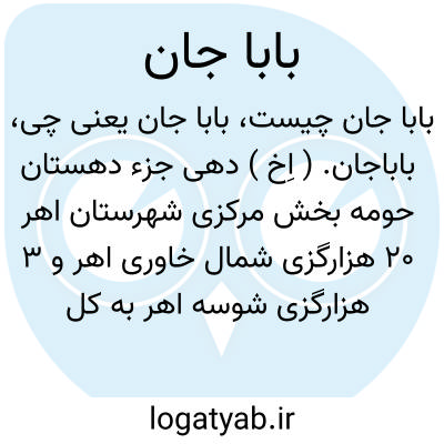 باباجان. ( اِخ ) دهی جزء دهستان حومه بخش مرکزی شهرستان اهر 20 هزارگزی شمال خاوری اهر و 3 هزارگزی شوسه اهر به کلیبر، کوهستانی معتدل. سکنه آن 536 تن، شیعه، آب آن از چشمه و محصول آن غلات، حبوبات و شغل اهالی زراعت و گله داری و صنایع دستی آنان گلیم و فرش بافی است. راه مالرو دارد. ( فرهنگ جغرافیائی ایران ج 4 ).