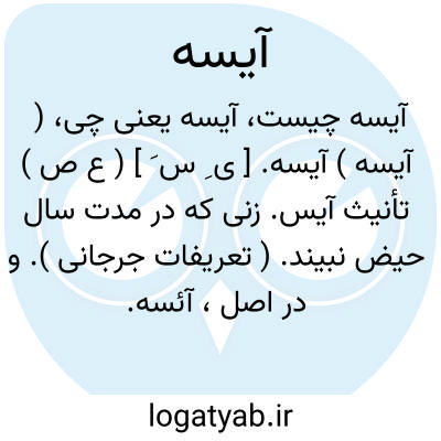 ( آیسه ) آیسه. [ ی ِ س َ ] ( ع ص ) تأنیث آیس. زنی که در مدت سال حیض نبیند. ( تعریفات جرجانی ). و در اصل، آئسه.