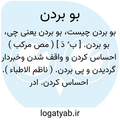 ۱ - استشمام کردن. ۲ - احساس کردن. ۳ - ادراک کردن فهمیدن. ۴ - واقف شدن خبردار گردیدن بطور اجمال. ۵- پی بردن نشان یافتن. یا بو بردن زخم. بدتر شدن زخم از بوی ناموافقی که بان برسد.