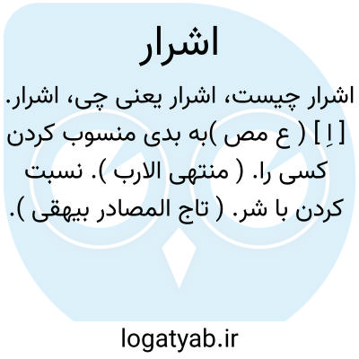 اشرار. [ اِ ] ( ع مص )به بدی منسوب کردن کسی را. ( منتهی الارب ). نسبت کردن با شر. ( تاج المصادر بیهقی ). نسبت کردن کسی را به شر. || پیدا کردن. ( منتهی الارب ). آشکارا کردن. ( تاج المصادر بیهقی ): و حتی اُشِرَّت بالاکُف المصاحف؛ ای نُشرت و اُظهرت. ( اقرب الموارد ). || به آفتاب نهادن چیزی را تا خشک شود. ( منتهی الارب ). به آفتاب نهادن گوشت یا کشک یا جامه را تا خشک شود. ( از اقرب الموارد ). || راندن و طرد کردن خاندان و قبیله کسی، وی را. ( از اقرب الموارد ).
