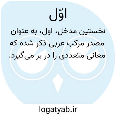 ( اسم ) ۱ - آغاز مقابل انجام پایان ۲ - نخست نخستین یکم مقابل آخر. جمع: اوایل اولون اولین. یا از اول تا آخر. از آغاز تا انجام. یا اول از همه. پیش از همه پیش از هر چیز. ۳ - (اسم ) اسمی است از اسمائ حسنی (خدا )